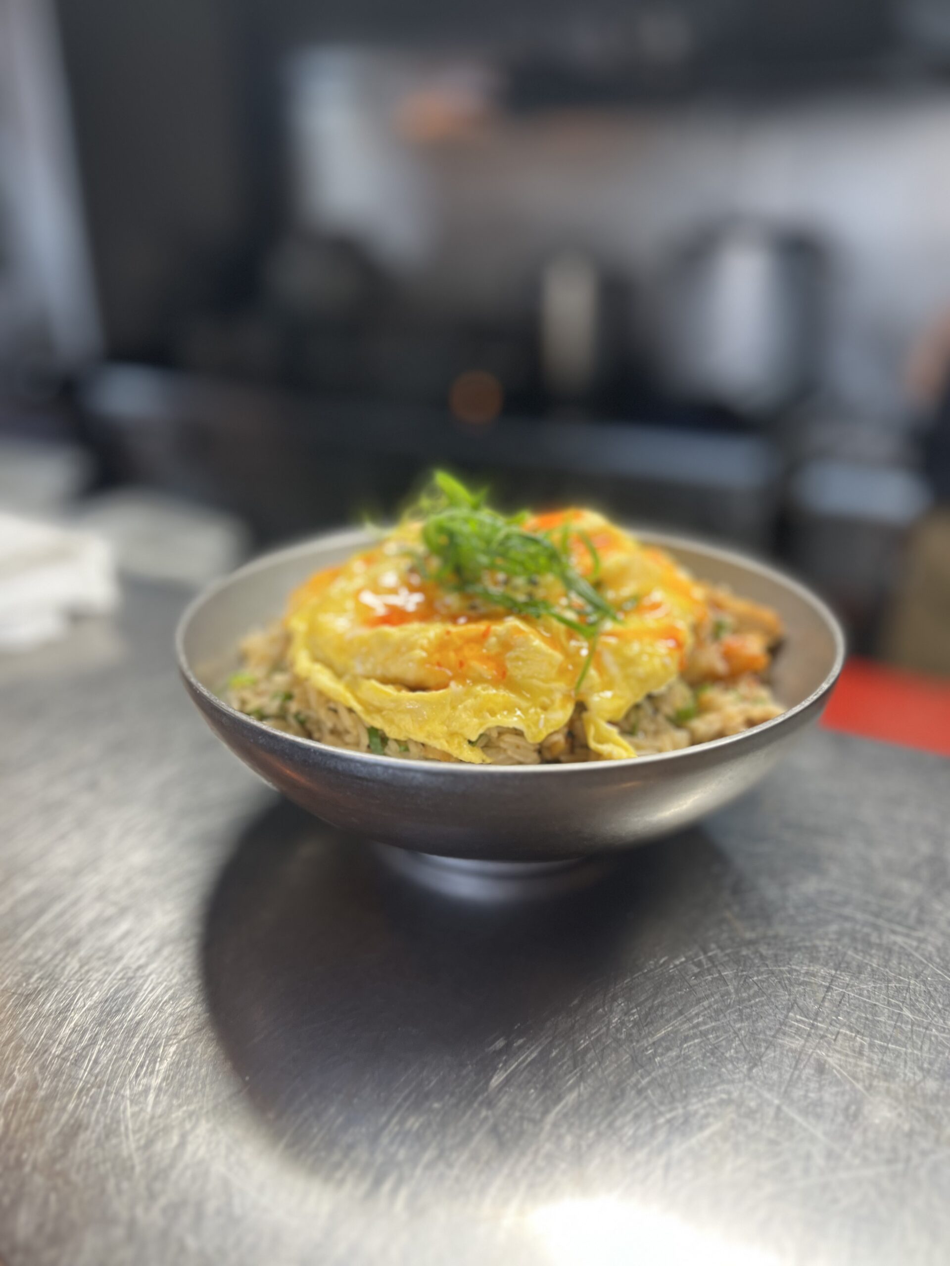 Arroz frito al wok con kion, ajo, pimiento, col, tortilla de huevo, salsa de sillao y ostras, aceite de ajonjolí y acompañado de pollo frito