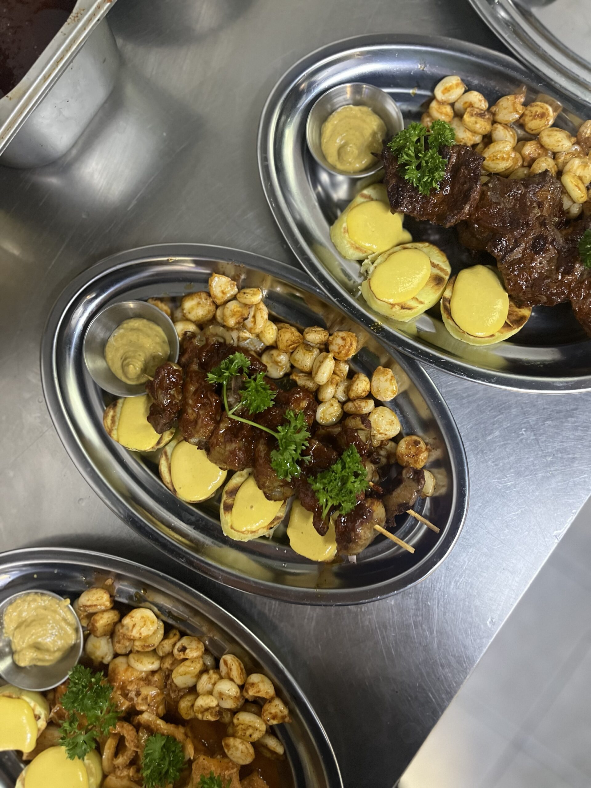 corazón de ternera a la parrilla macerado en salsa anticuchera acompañado de mote, papa a le huancaína y pají de pollería.