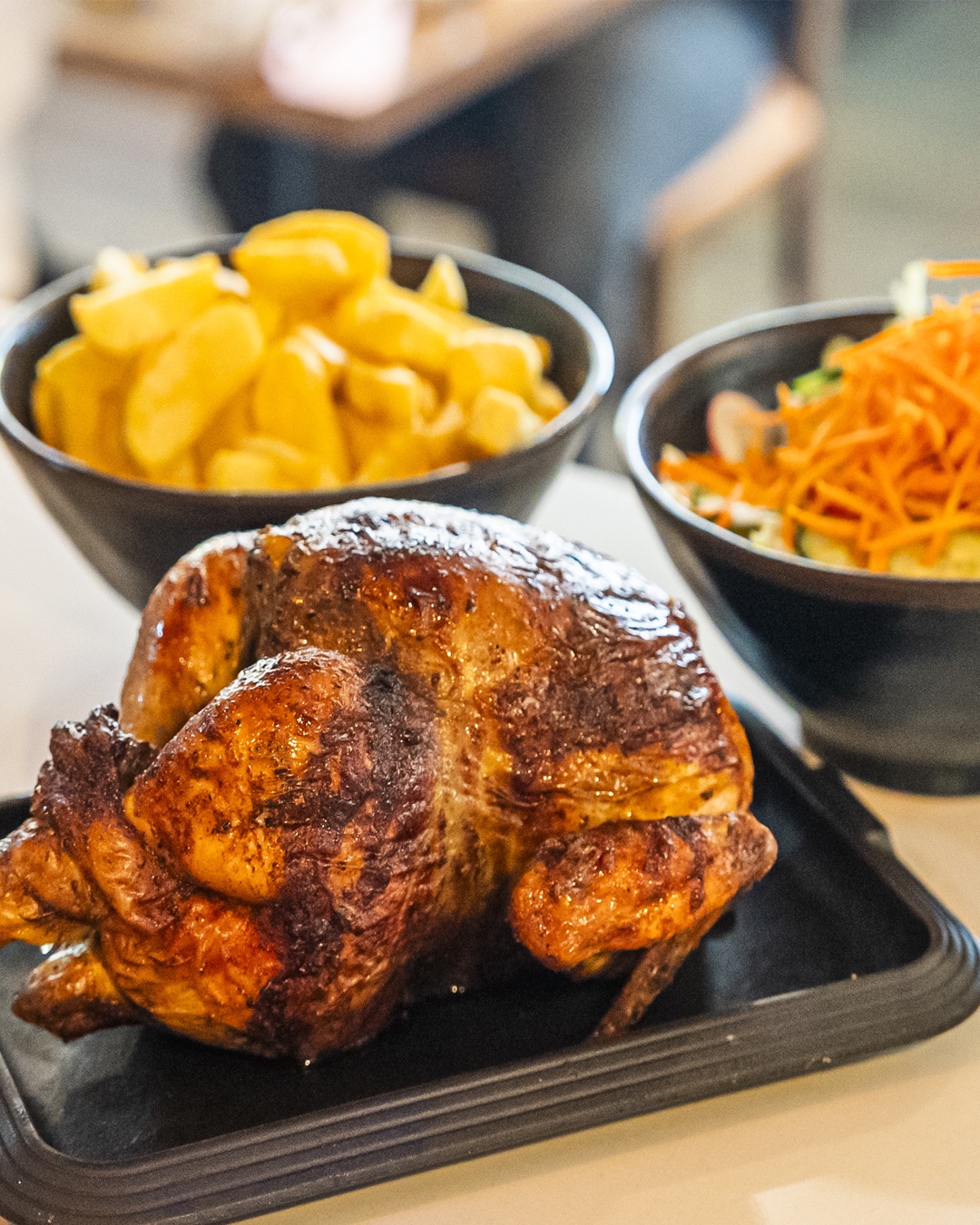 Dos muslos y dos pechugas. Siempre acompañado de papas fritas y ensalada.